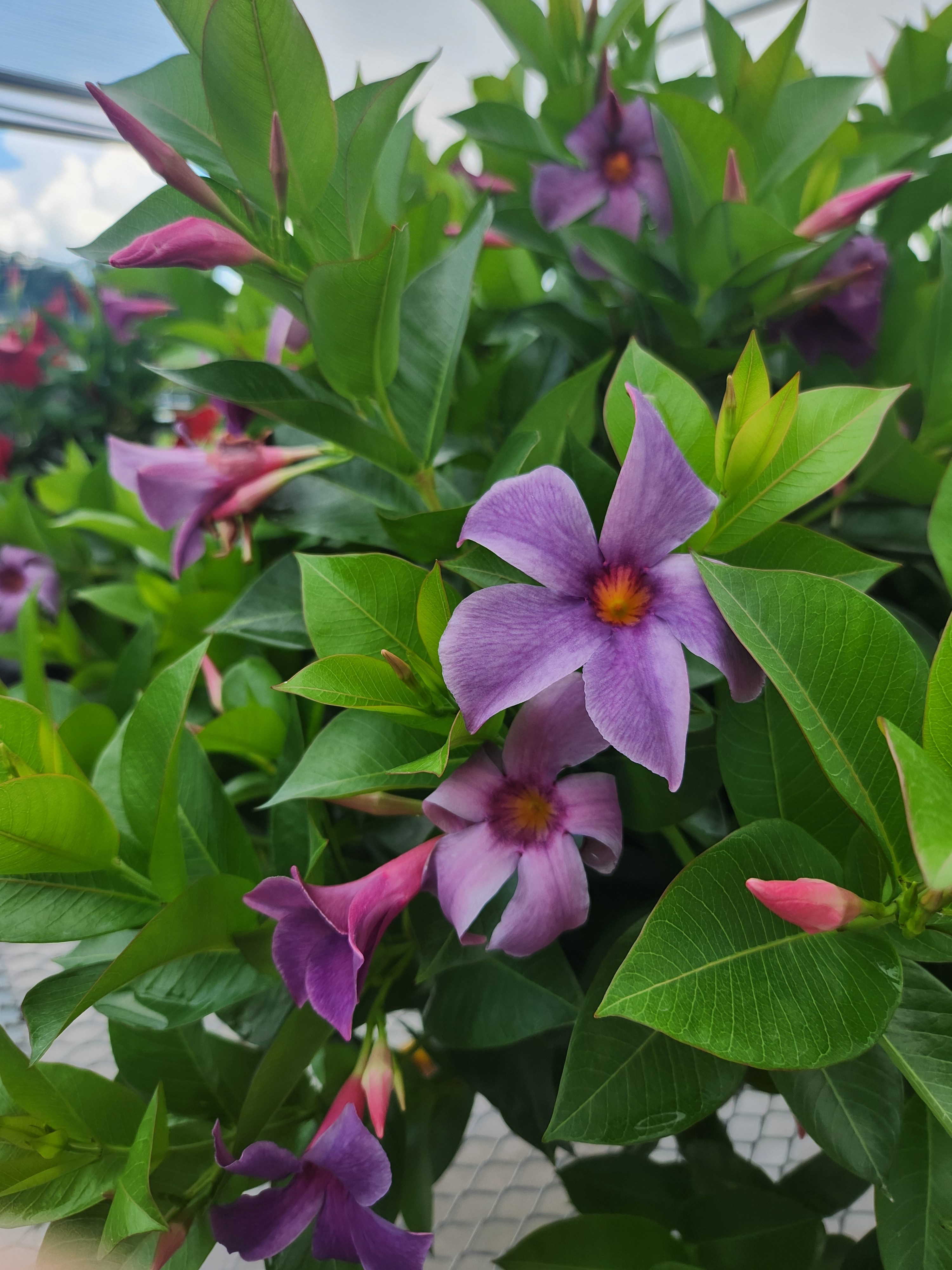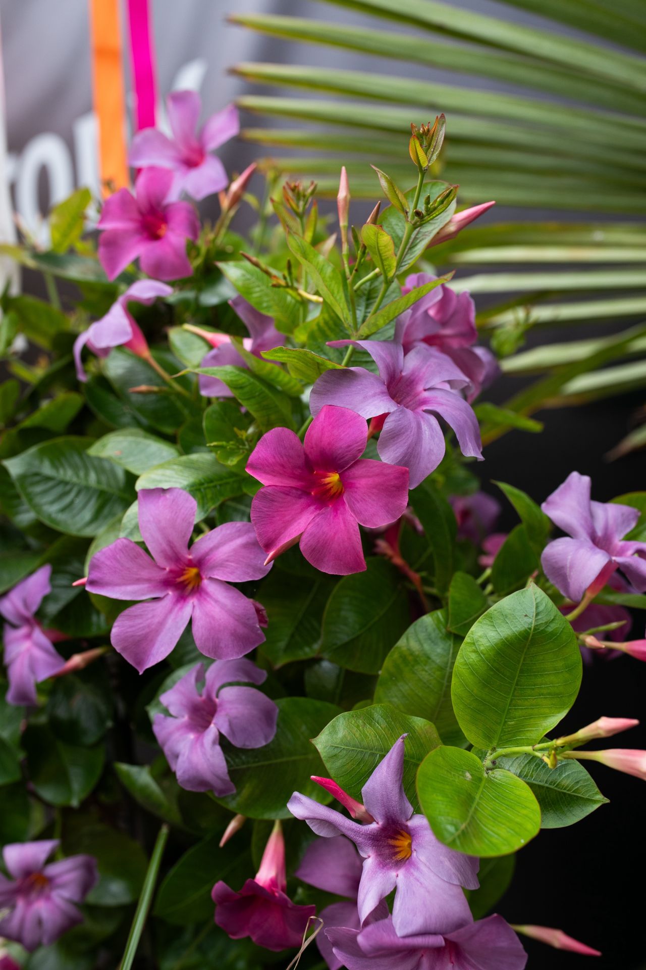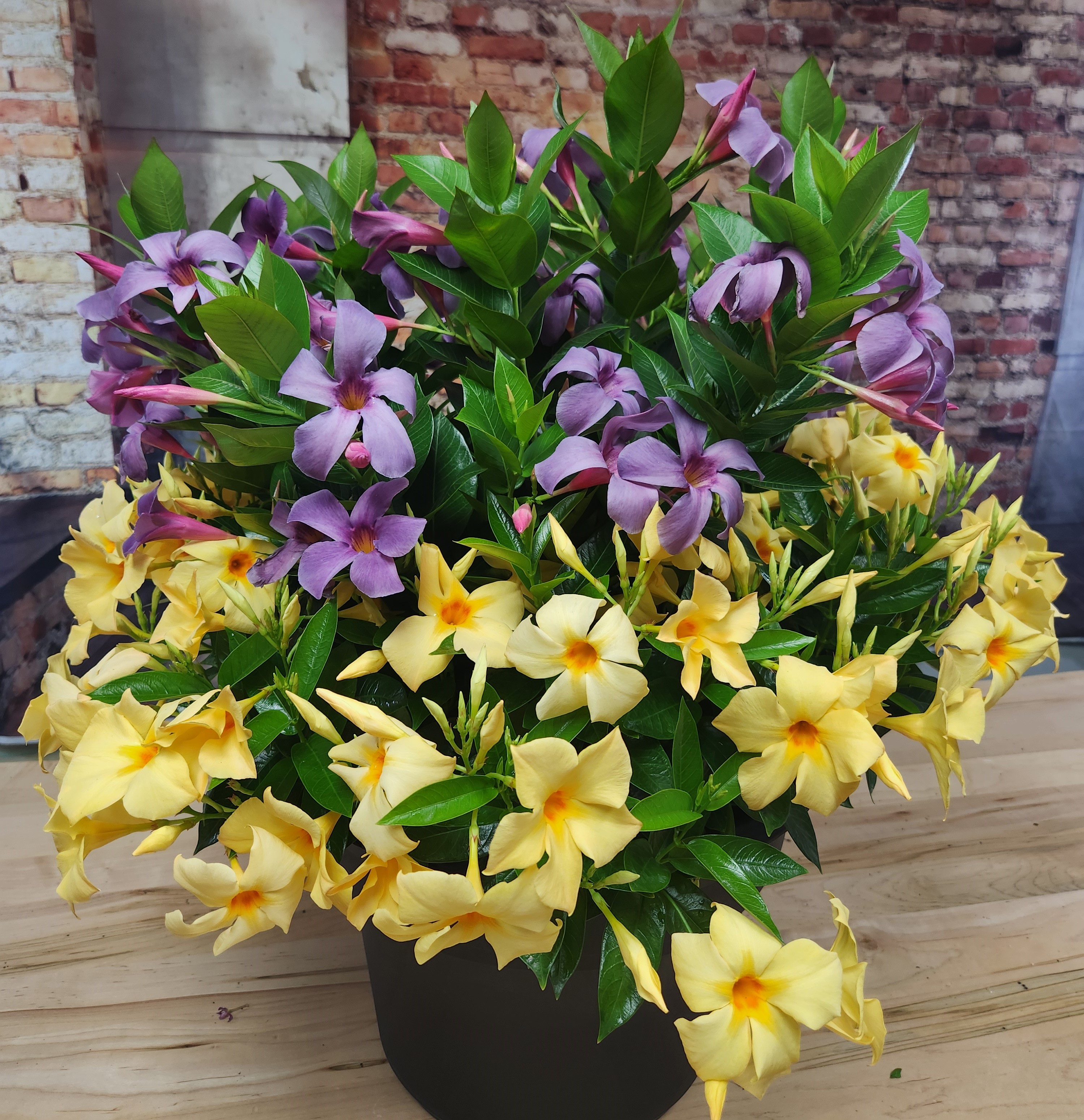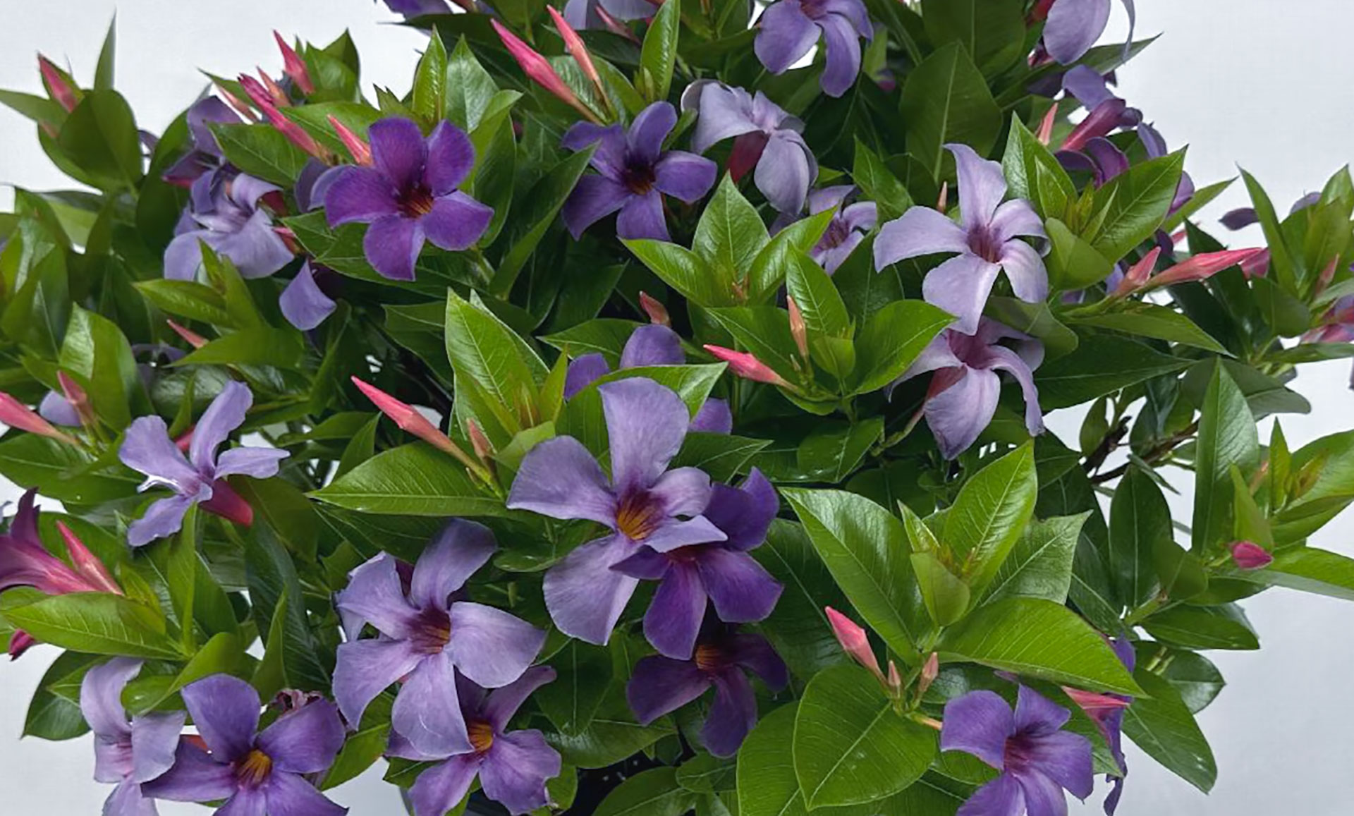 Mandevilla Sun Parasol Original XP has superior branching and flower power! Earlier to flower with outstanding, exciting colors like the first yellow flower Sunbeam, the new Bluephoria™ with blue flowers starting with pink buds, the new Mauvelous with brush stroke color of mauve pink blooms, and Double Pink Blush, a FleuroStar winner of a true double bloom in pink. All are excellent plants for gardens, containers, and hanging baskets.